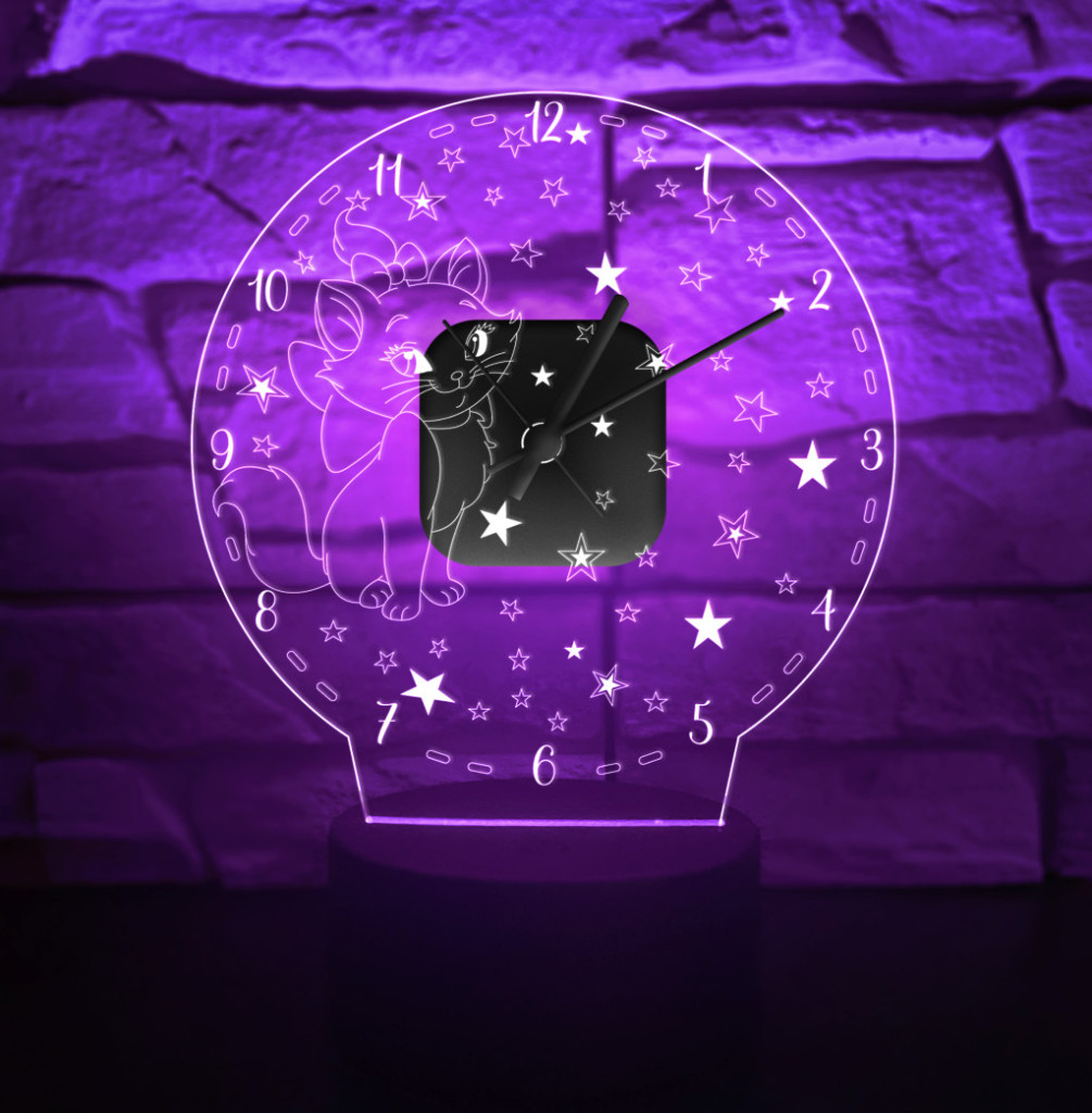 A dekoratív 3D LED lámpa beépített óraszerkezettel rendelkezik, így egyszerre stílusos világítás és hasznos időmérő.