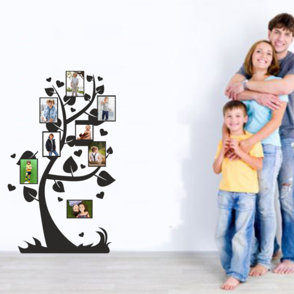 Egyedi Családfa falmatrica – fényképes falmatrica/falikép. Családi fotókkal kiegészíthető, személyre szabható névvel, dátummal, felirattal.