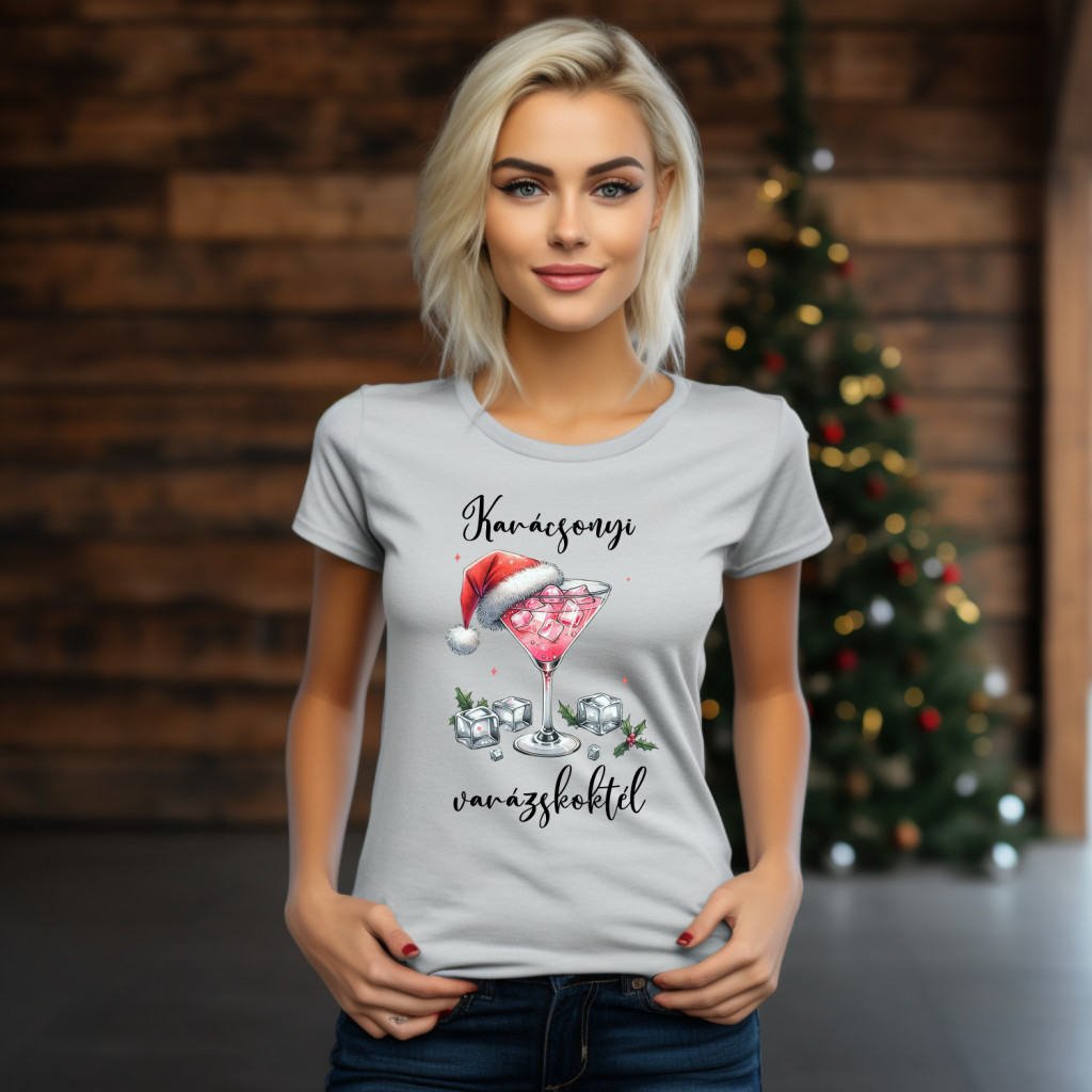 Stílusos karácsonyi póló „Karácsonyi varázskoktél” mintával, tökéletes választás ünnepi bulikra és ajándéknak is.
