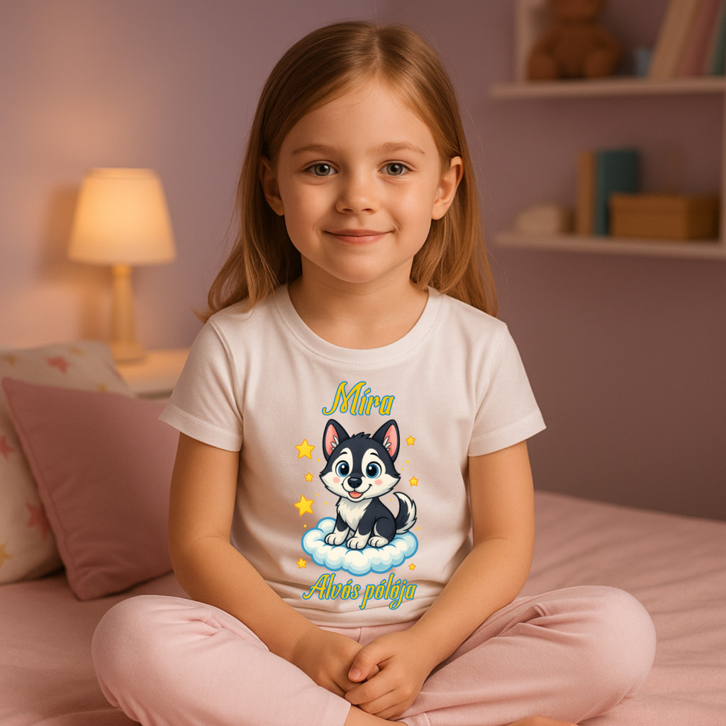 Egyedi alvós póló kislányoknak – névvel és cuki kutyus karakterrel