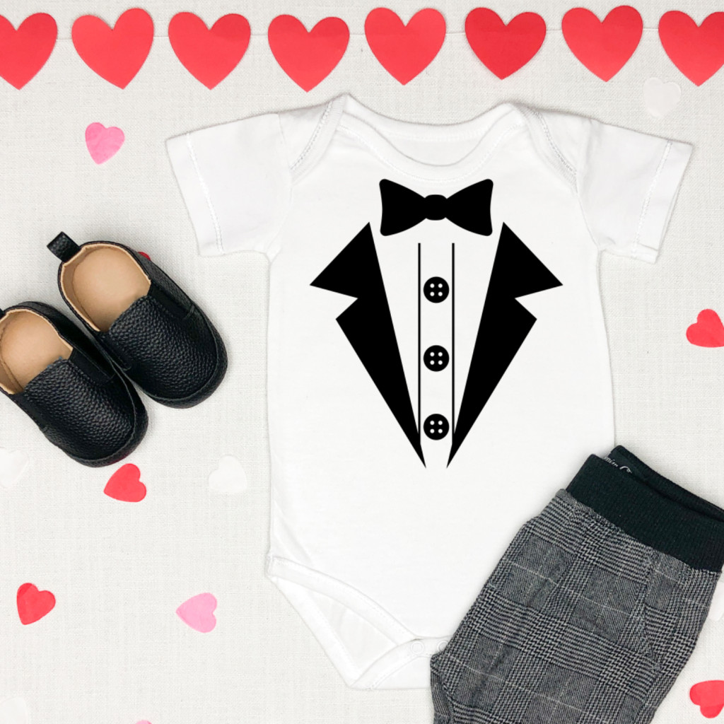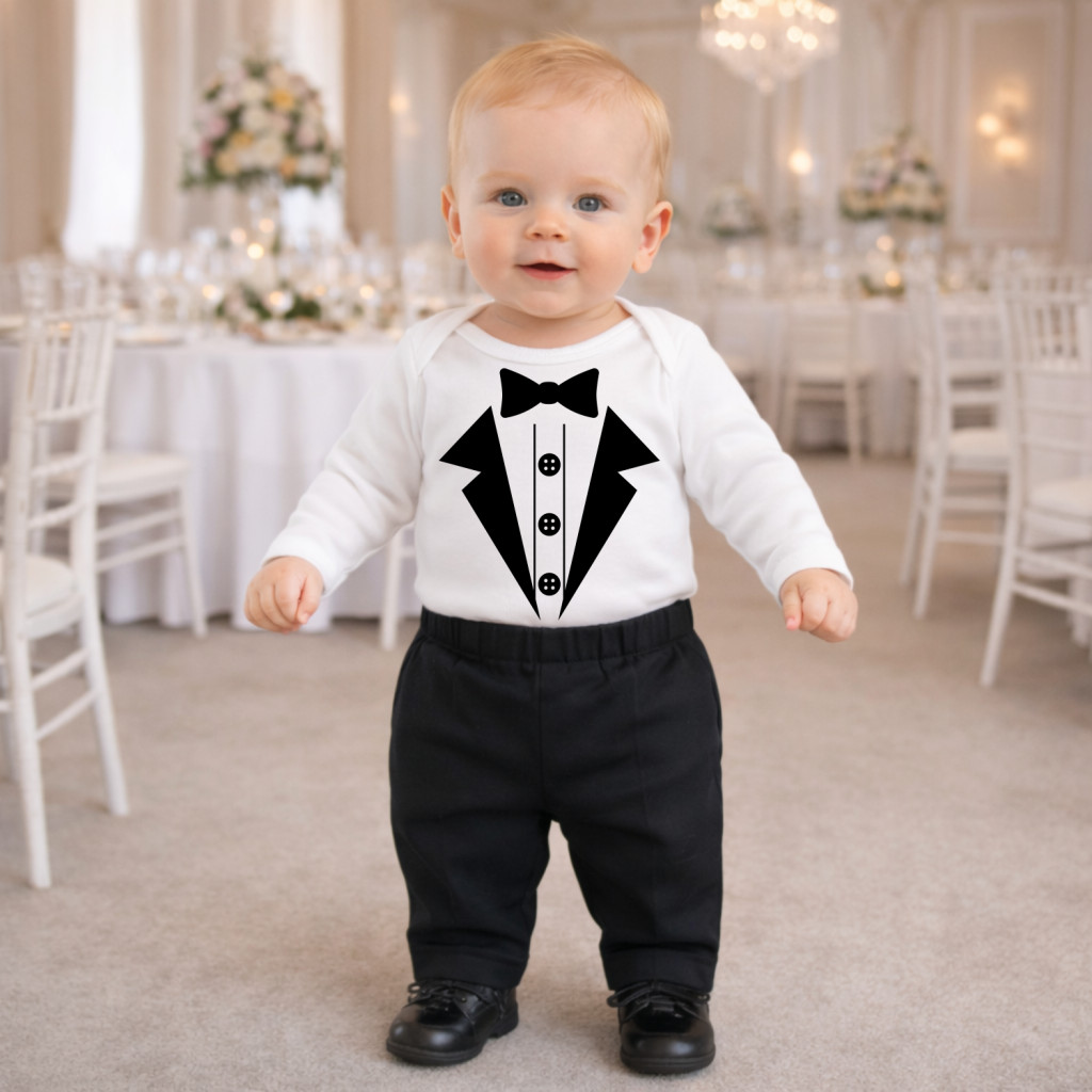 Szeretnéd, ha a baba öltözéke tökéletesen passzolna az esemény dekorációjához, vagy az apuka nyakkendőjéhez? Nálunk ezt is megteheted! Bár a klasszikus fekete-fehér összeállítás sosem megy ki a divatból, a grafika több féle minta színnel is választható, így az elegáns dizájnt teljesen a ti igényeitekre és a nagy alkalom színvilágára szabhatjátok.