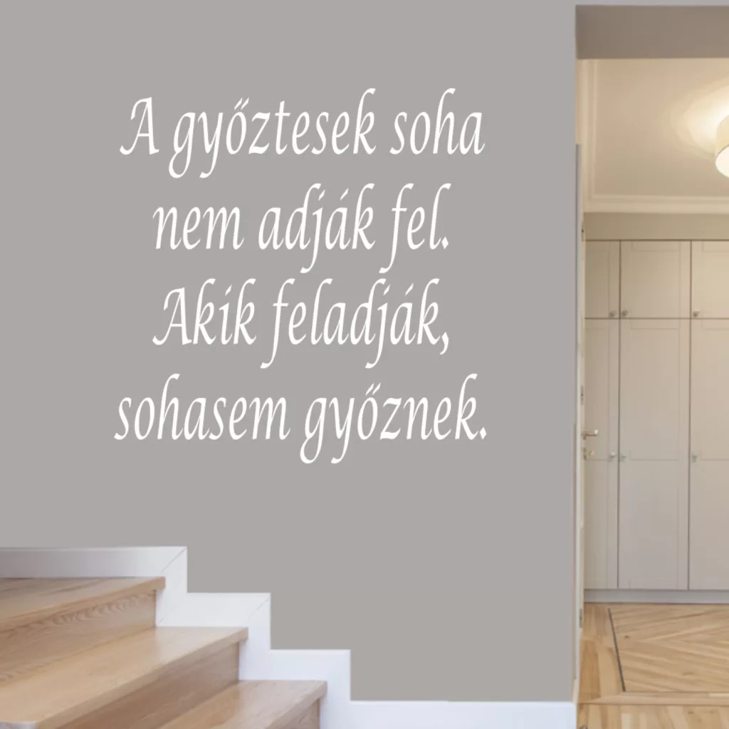 A(z) Motiváló Idézet – A Győztesek Soha Nem Adják Fel Falmatrica egy különleges idézetes falmatrica, amely inspiráló gondolatokkal és pozitív energiával tölti meg otthonod falait. Ideális választás azoknak, akik szeretnének minden nap motivációt meríteni a környezetükből.