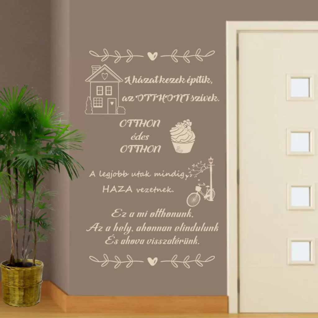 A(z) A házat kezek építik, az otthont szívek – Idézet falmatrica egy különleges idézetes falmatrica, amely inspiráló gondolatokkal és pozitív energiával tölti meg otthonod falait. Ideális választás azoknak, akik szeretnének minden nap motivációt meríteni a környezetükből.