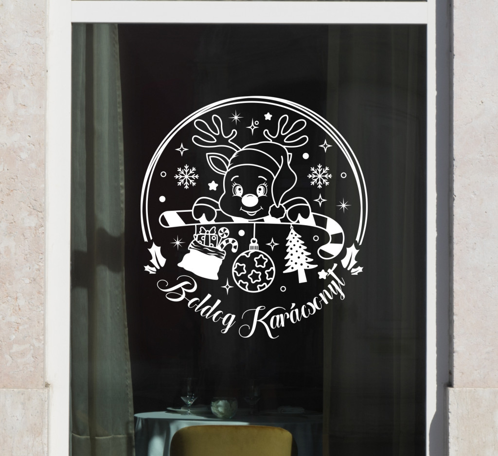 Különleges karácsonyi ablakmatrica, amelyen egy aranyos rénszarvas és ünnepi díszek jelennek meg „Boldog Karácsonyt” felirattal.
