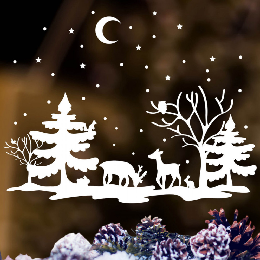 Varázsold ünnepivé otthonod ezzel a gyönyörű karácsonyi ablakmatricával, amely havas erdőt, szarvasokat és apró állatokat ábrázol. Meghitt téli hangulatot teremt bármelyik helyiségben.