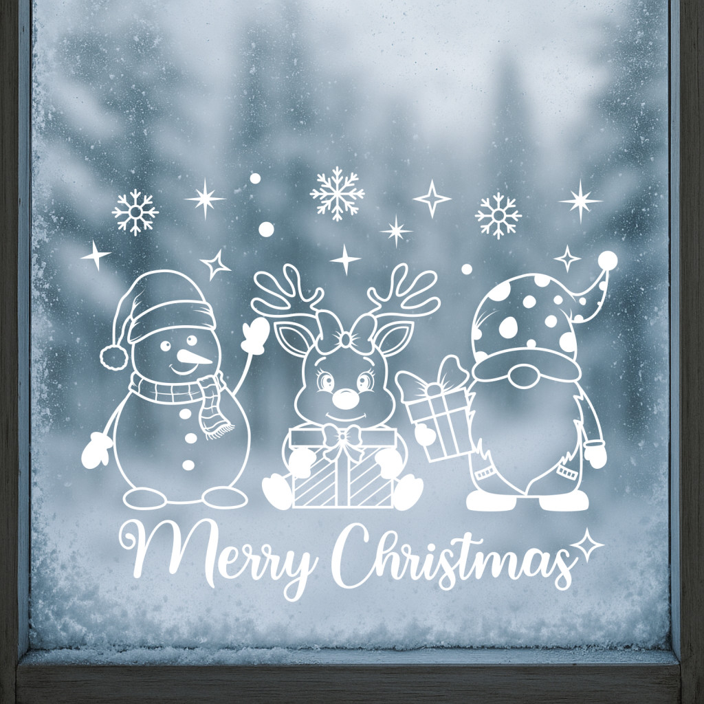 Ez a hóembert, ajándékot tartó rénszarvast és manót ábrázoló ablakmatrica azonnal ünnepi hangulatot teremt otthonodban vagy üzletedben.
