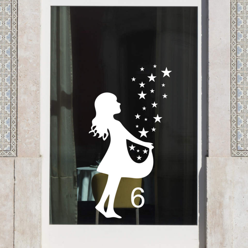 Ez a különleges ablakmatrica egy csillagokat szóró kislány sziluettjét ábrázolja, amely azonnal meghitt és varázslatos karácsonyi hangulatot teremt otthonodban.