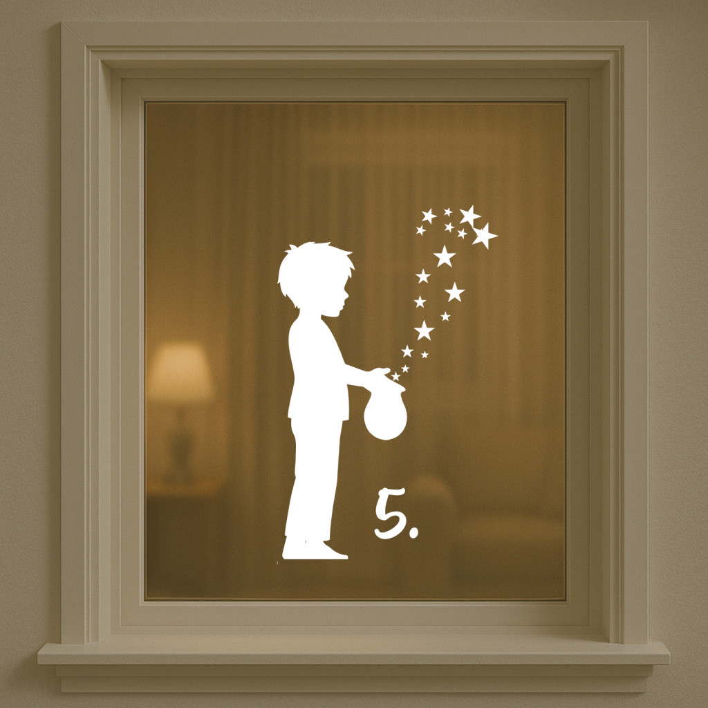 A csillagszóró kisfiú mintája meghitt karácsonyi atmoszférát teremt, a választható szám pedig igazán személyessé teszi az ablakdekorációt.