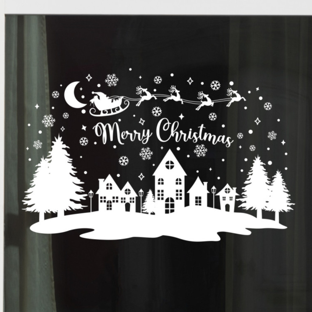 Ez a városkép mintás karácsonyi ablakmatrica varázslatos hangulatot teremt, mintha egy téli mesefalut látnál az üvegen keresztül.