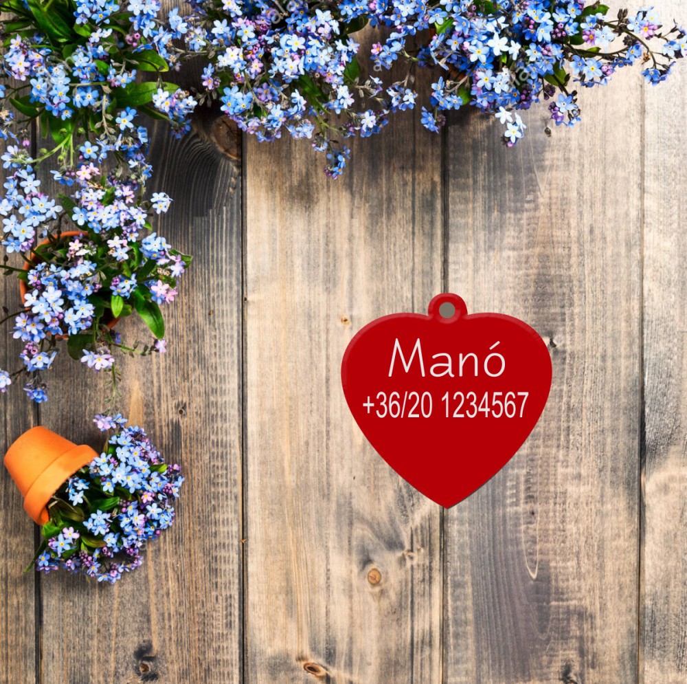 Szív alakú biléta. Termék ára a gravírozást is tartalmazza. Viselje kedvenced a nyakörvére erősített bilétát, nevével és a telefonszámoddal, ha esetleg elkóborolna, könnyebben haza juthasson. A biléták készítését vállaljuk egy illetve kétoldalas kivitelben. Döntsd el, mit szeretnél rágravíroztatni, kérhetsz egyedi szöveget is.