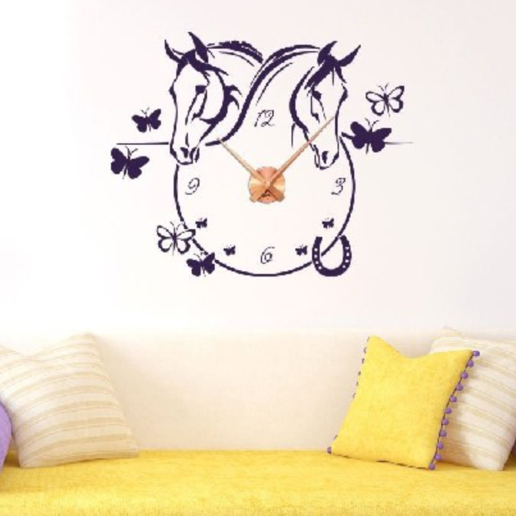 A(z) Lovas Falióra Falmatrica – Pillangós dekoráció óraszerkezettel egy elegáns lovas falmatrica, amely dinamizmust és inspiráló hangulatot ad otthonodnak.