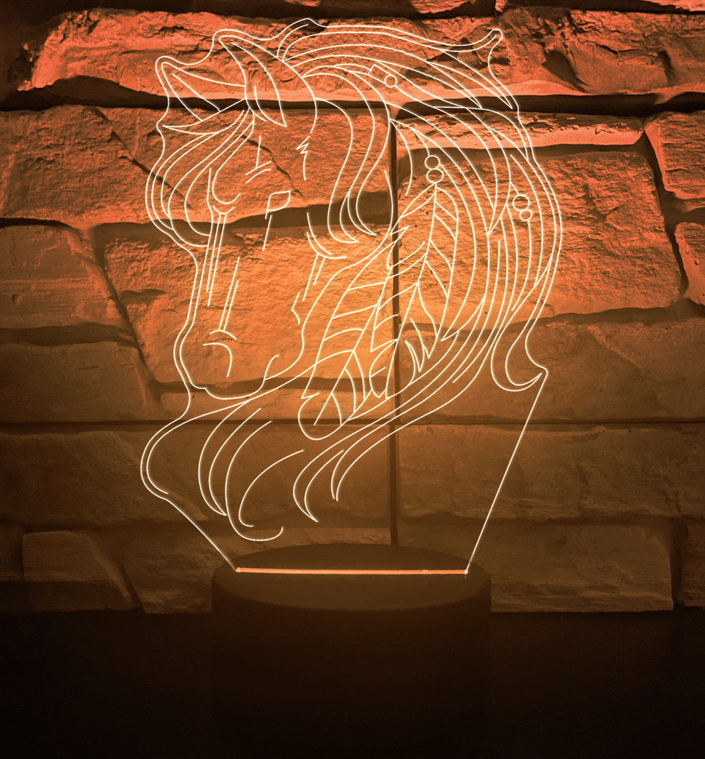 Egyedi Lovas 7 színű 3D LED lámpa – állatos 3D LED lámpa. Látványos fénydekoráció gyerekszobába, nappaliba vagy ajándékba; személyre szabható névvel és felirattal.