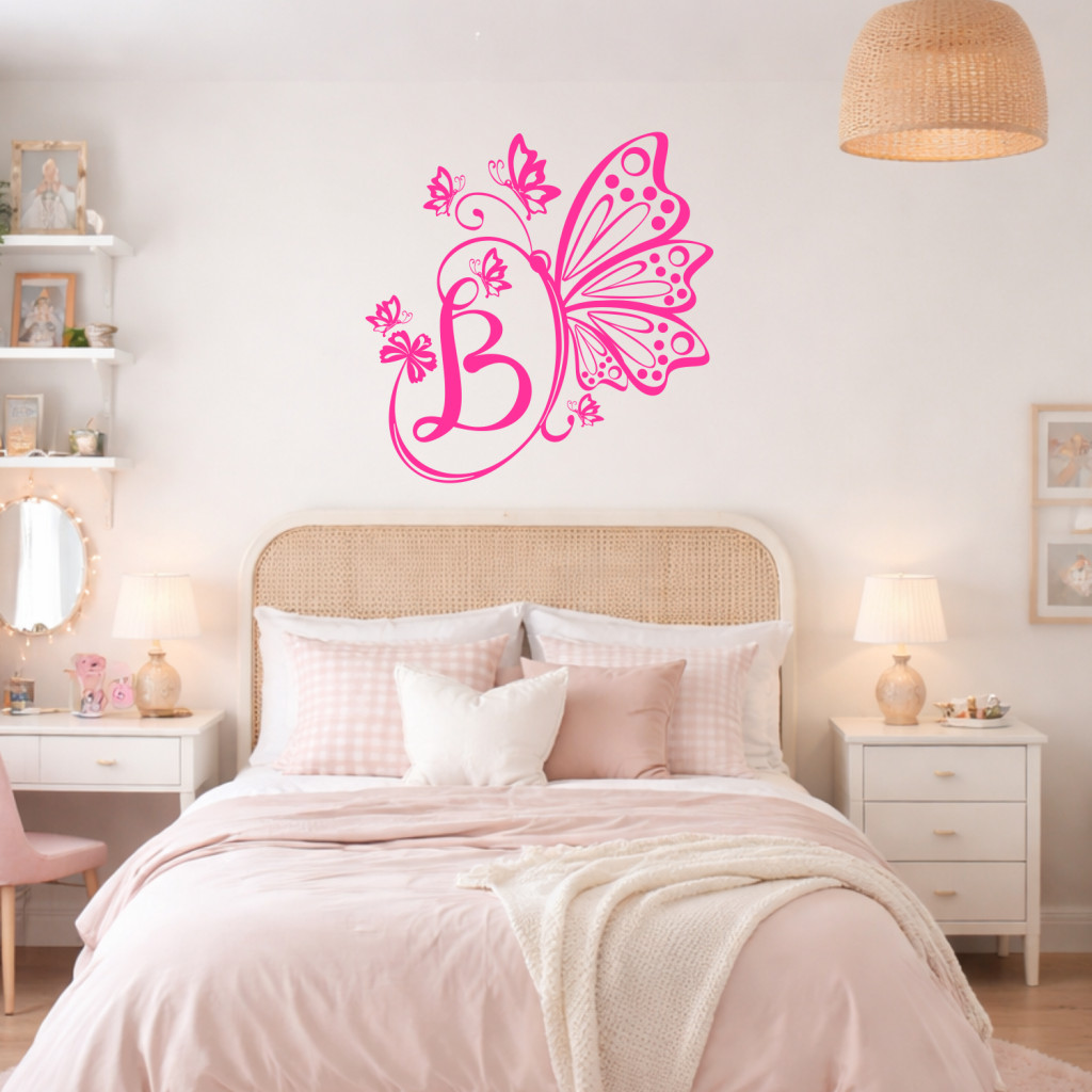 Ez a dekoratív monogramos pillangós motívum a személyre szabott lakberendezés ékköve. A központi nagybetűt körbeölelő kecses pillangók és finom indák egyedi vizuális történetet mesélnek el, amely kiemeli a szoba tulajdonosának egyéniségét, miközben lágy és barátságos környezetet teremt.