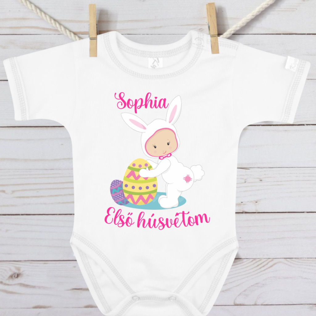 Keresed a tökéletes ruhácskát a kislányod legelső tavaszi ünnepére? Ez a nevesített darab egy igazán különleges és szívhez szóló választás! A grafikán egy imádnivaló, fehér nyuszijelmezbe bújó, rózsaszín masnis kisbaba látható, aki egy hatalmas, színes hímes tojást ölel magához. A minta fölé a gyermeked saját nevét, alá pedig az "Első húsvétom" feliratot nyomtatjuk elegáns rózsaszín betűkkel, így ez a ruha egy csodás, örök emlék marad az első locsolkodásról.