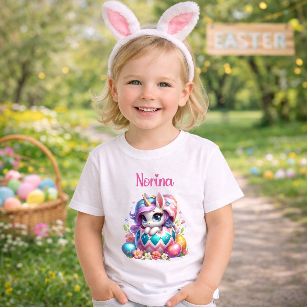 Varázsolj mosolyt mindenki arcára ezzel a tündéri, személyre szabható baba felsővel! A mintán egy gyönyörű, színes húsvéti tojásból kikukucskáló kis unikornis látható, apró tojásokkal és tavaszi virágokkal körülvéve. A bájos grafika fölé a kislányod saját nevét nyomtatjuk, így ez az egyedi darab garantáltan a legkülönlegesebb ünnepi emlékké válik a rokonlátogatások során.