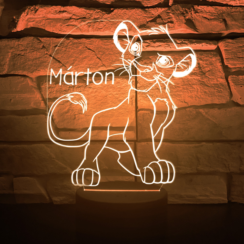 Egyedi Oroszlánkirály 7 színű 3D LED lámpa – gyerekszobai 3D LED lámpa. Mesés hangulatvilágítás, amely személyre szabható névvel és felirattal.