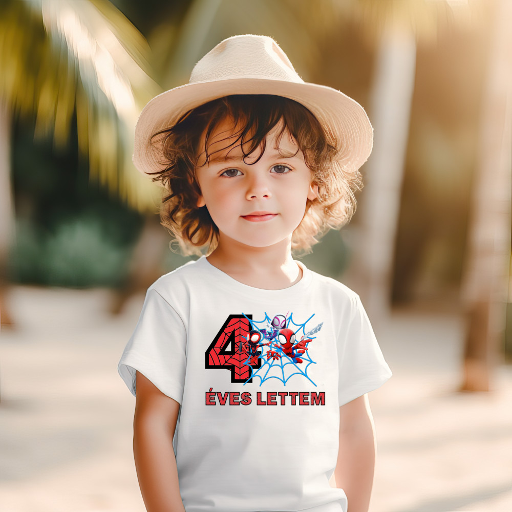 Vidám, pókos mintás születésnapi póló kisfiúknak, akik imádják a hősöket és a kalandokat. A látványos grafika garantáltan feldobja a szülinapi fotókat és a napot is.