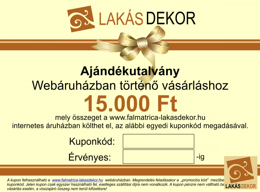 A kupon felhasználható a www.falmatrica-lakasdekor.hu webáruházban. Megrendelés feladásakor a „promociós kód” mezőbe írható be a kuponkód.