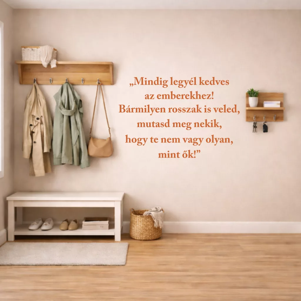 A(z) Mindig legyél kedves az emberekhez! Bármilyen rosszak is veled, mutasd meg nekik, hogy te nem vagy olyan, mint ők!" a idézet falmatrica egy különleges idézetes falmatrica, amely inspiráló gondolatokkal és pozitív energiával tölti meg otthonod falait. Ideális választás azoknak, akik szeretnének minden nap motivációt meríteni a környezetükből.
