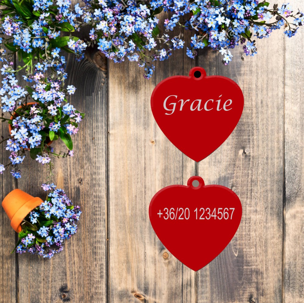 Szív alakú biléta. Termék ára a gravírozást is tartalmazza. Viselje kedvenced a nyakörvére erősített bilétát, nevével és a telefonszámoddal, ha esetleg elkóborolna, könnyebben haza juthasson. A biléták készítését vállaljuk egy illetve kétoldalas kivitelben. Döntsd el, mit szeretnél rágravíroztatni, kérhetsz egyedi szöveget is.