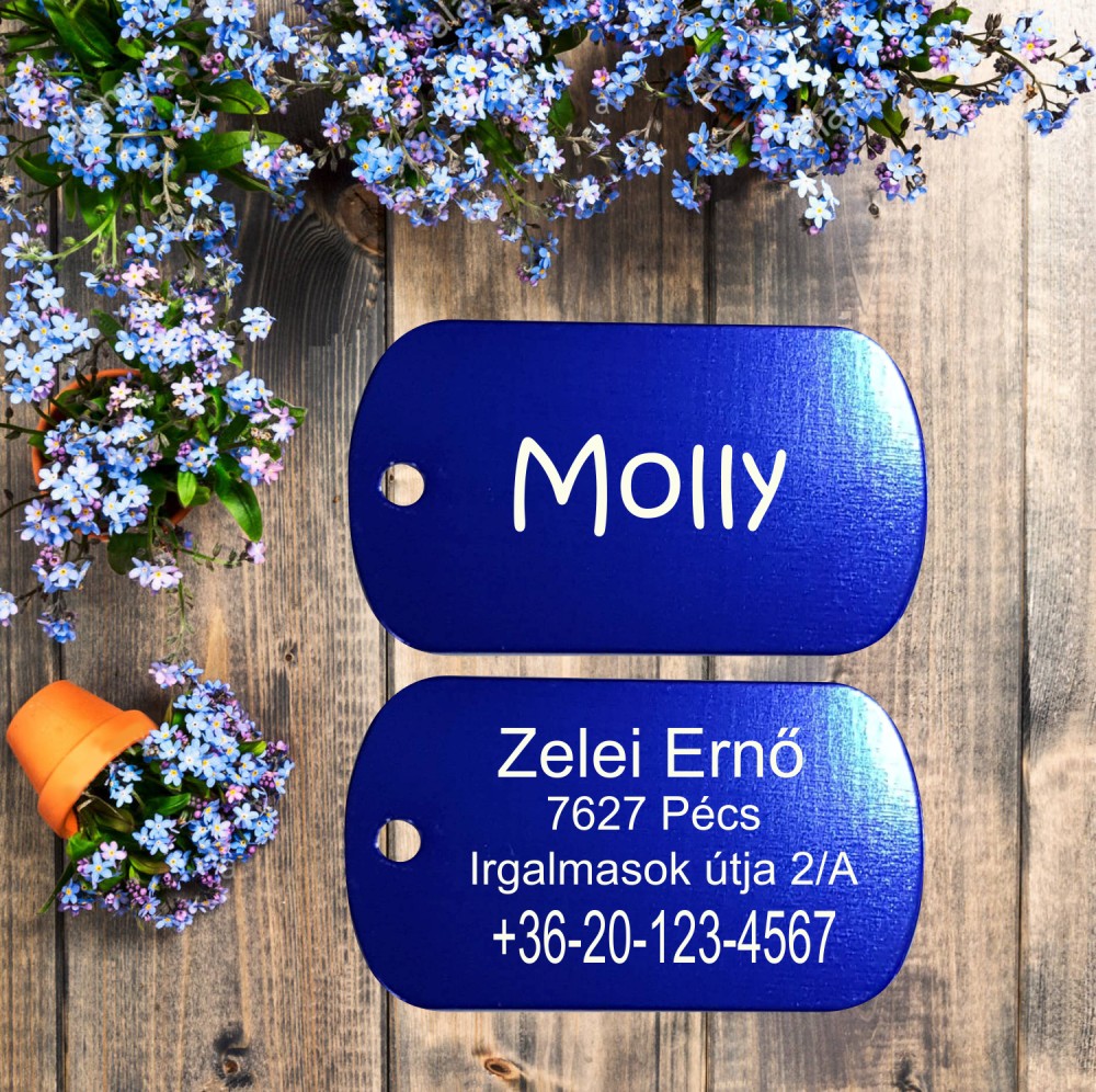 Dögcédula alakú biléta. Termék ára a gravírozást is tartalmazza. Viselje kedvenced a nyakörvére erősített bilétát, nevével és a telefonszámoddal, ha esetleg elkóborolna, könnyebben haza juthasson. A biléták készítését vállaljuk egy illetve kétoldalas kivitelben. Döntsd el, mit szeretnél rágravíroztatni, kérhetsz egyedi szöveget is.