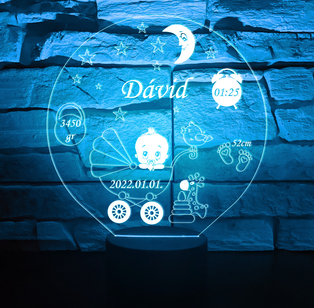 A(z) Személyre szabható Fiú Babás 7 színű 3D LED lámpa – Születési adatokkal egy gyerekszobába tervezett 3D LED lámpa, amely mesés fényhatással és vidám mintákkal varázsolja különlegessé a szobát. Segít megnyugtatni a gyerekeket elalvás előtt, miközben stílusos dekorációként is szolgál.