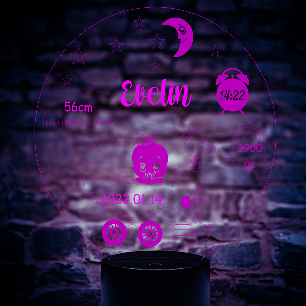 A(z) Személyre szabott újszülött baba éjjeli LED lámpa – születési információkkal egy gyerekszobába tervezett 3D LED lámpa, amely mesés fényhatással és vidám mintákkal varázsolja különlegessé a szobát. Segít megnyugtatni a gyerekeket elalvás előtt, miközben stílusos dekorációként is szolgál.