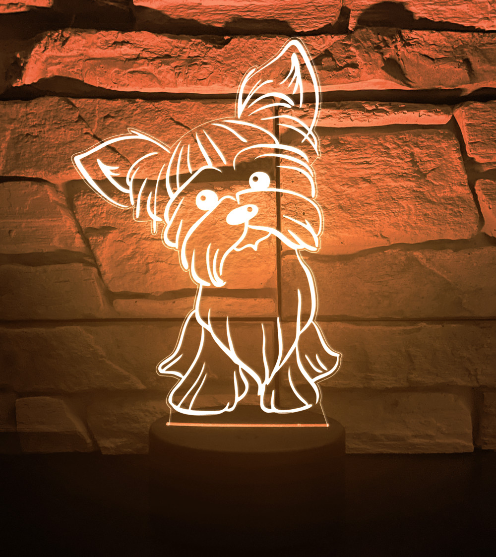 Egyedi Yorkie 7 színű 3D LED lámpa – állatos 3D LED lámpa. Látványos fénydekoráció gyerekszobába, nappaliba vagy ajándékba; személyre szabható névvel és felirattal.